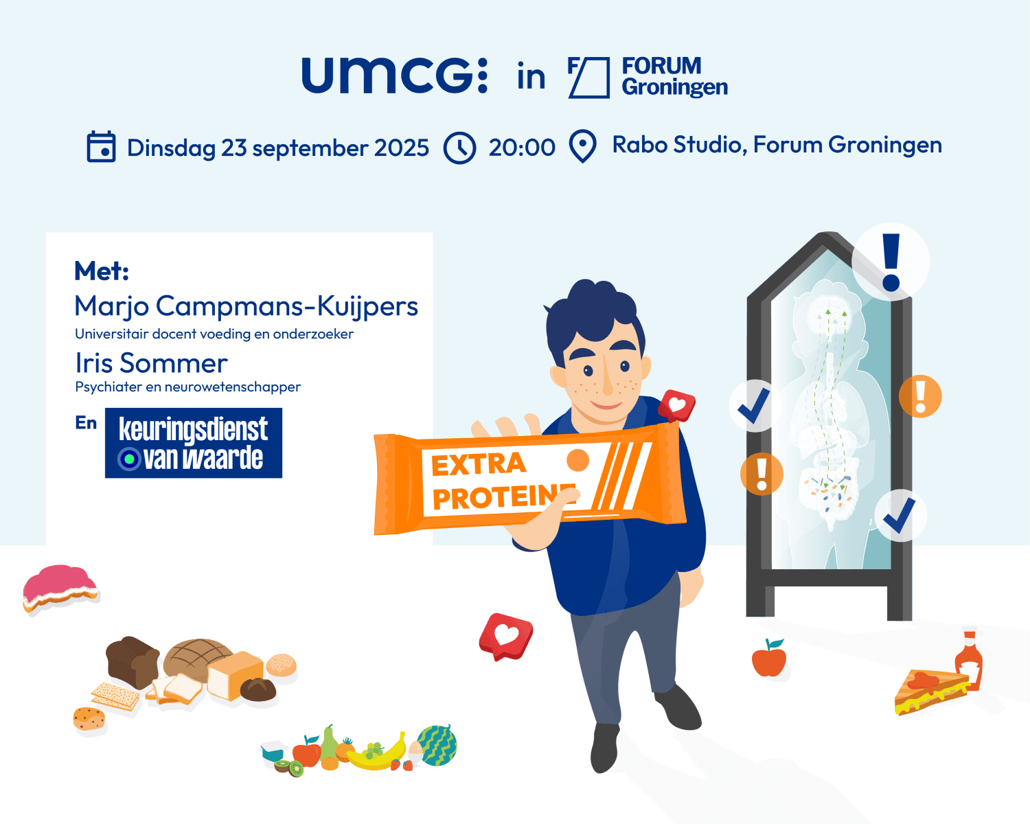 Tijdens UMCG in het Forum op 23 september van 20:00 tot 21:30 uur gaan we met experts in gesprek over wat écht bewezen gezond is. Marjo Campmans-Kuijpers, universitair docent voeding en onderzoeker in het UMCG, vertelt of gezonde voeding ook een medicijn kan zijn en of je er misschien zelfs ziekte mee kunt voorkomen. Ze ontwikkelde onder andere een ontstekingsremmend dieet voor mensen met de ziekte van Crohn. Ook schuift Iris Sommer aan, die met haar studie No Guts No Glory onderzoekt of het verbeteren van de darmgezondheid door voeding een gunstig effect heeft op veelvoorkomende hersenaandoeningen.